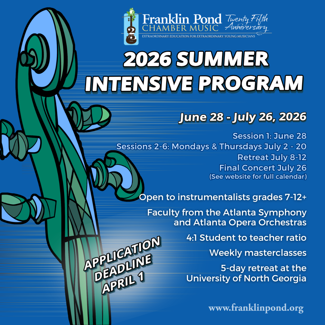 Franklin Pond is a year-round chamber music program for young string students in grades 6 through 12. Through the study of chamber music, student develop their artistic and interpretive talents, as well as strengthen their leadership, expression, and communication skills. Students have regular coachings with coaching artists, members from the Atlanta Symphony Orchestra, masterclasses with guest artists from all over the nation, special classes like career development, eurythmics, and Alexander Technique, and multiple opportunities to perform in public.